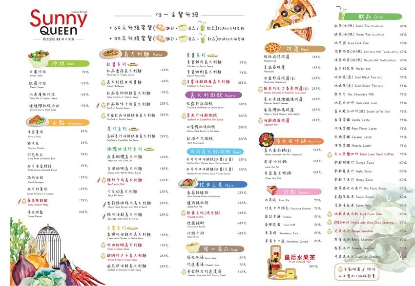 餐點是以義式料理為主,義大利麵、披薩、燉飯等,另外還有像是經典主菜、陽光風味鍋等選擇,價位中上,看是要單點還是加60~100元升級套餐都可以,10%服務費外加,整體客單價大約是300~400元左右,份量是足夠吃飽的。(點圖片可以看放大版菜單)