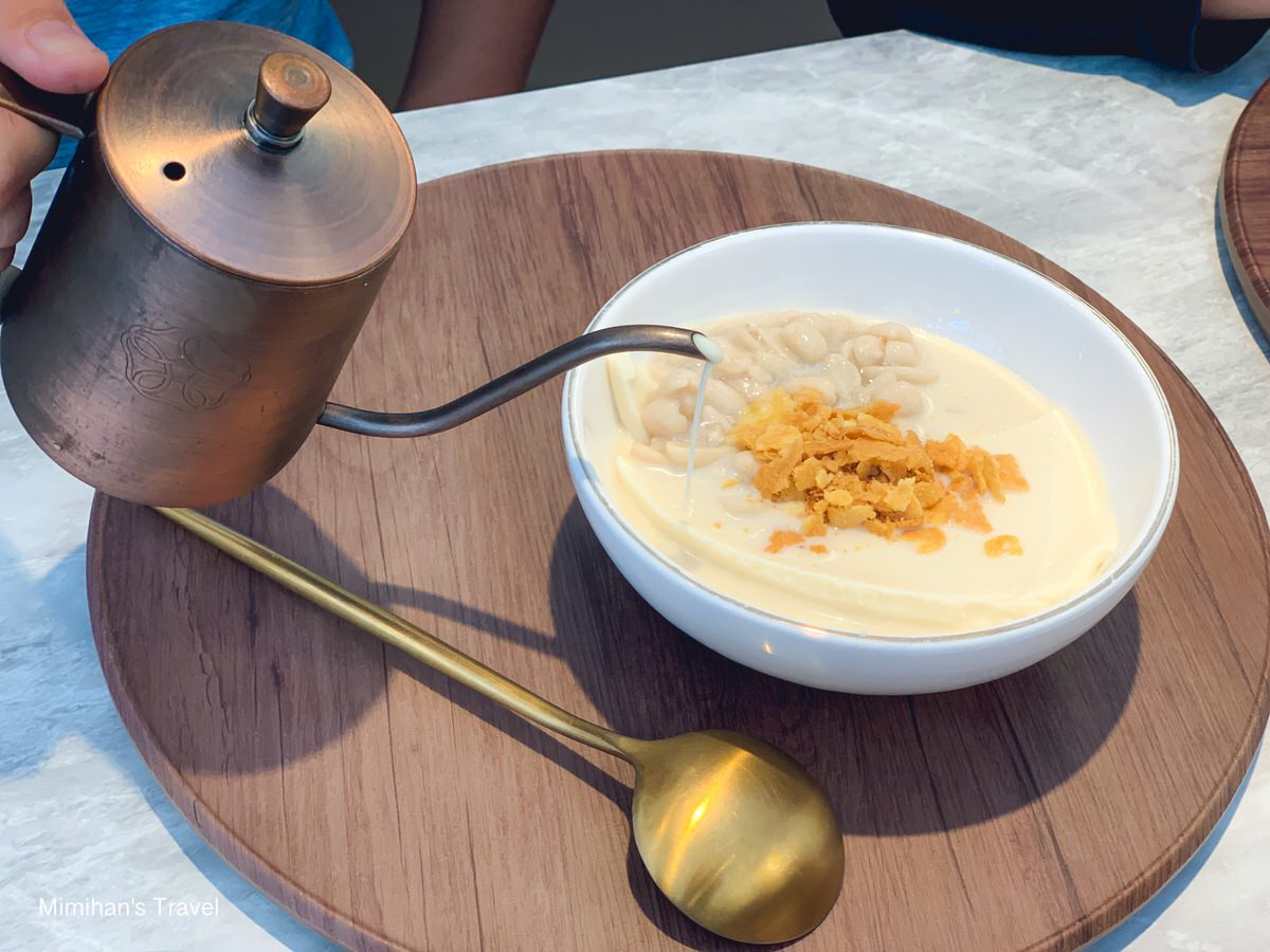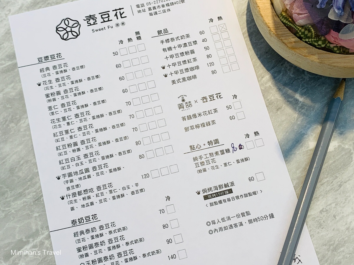 這間「壺豆花」是最近很夯的嘉義IG美食,以豆花店來說真的是美翻天,而且和傳統豆花都是加糖水不同,壺豆花菜單上有嘉義知名的豆漿豆花和蠻特別的泰奶豆花,兩種都很有人氣,整體環境美餐點有特色,幸好我們這天開店前就抵達,否則不到三分鐘就客滿加排隊真的是很厲害啊!