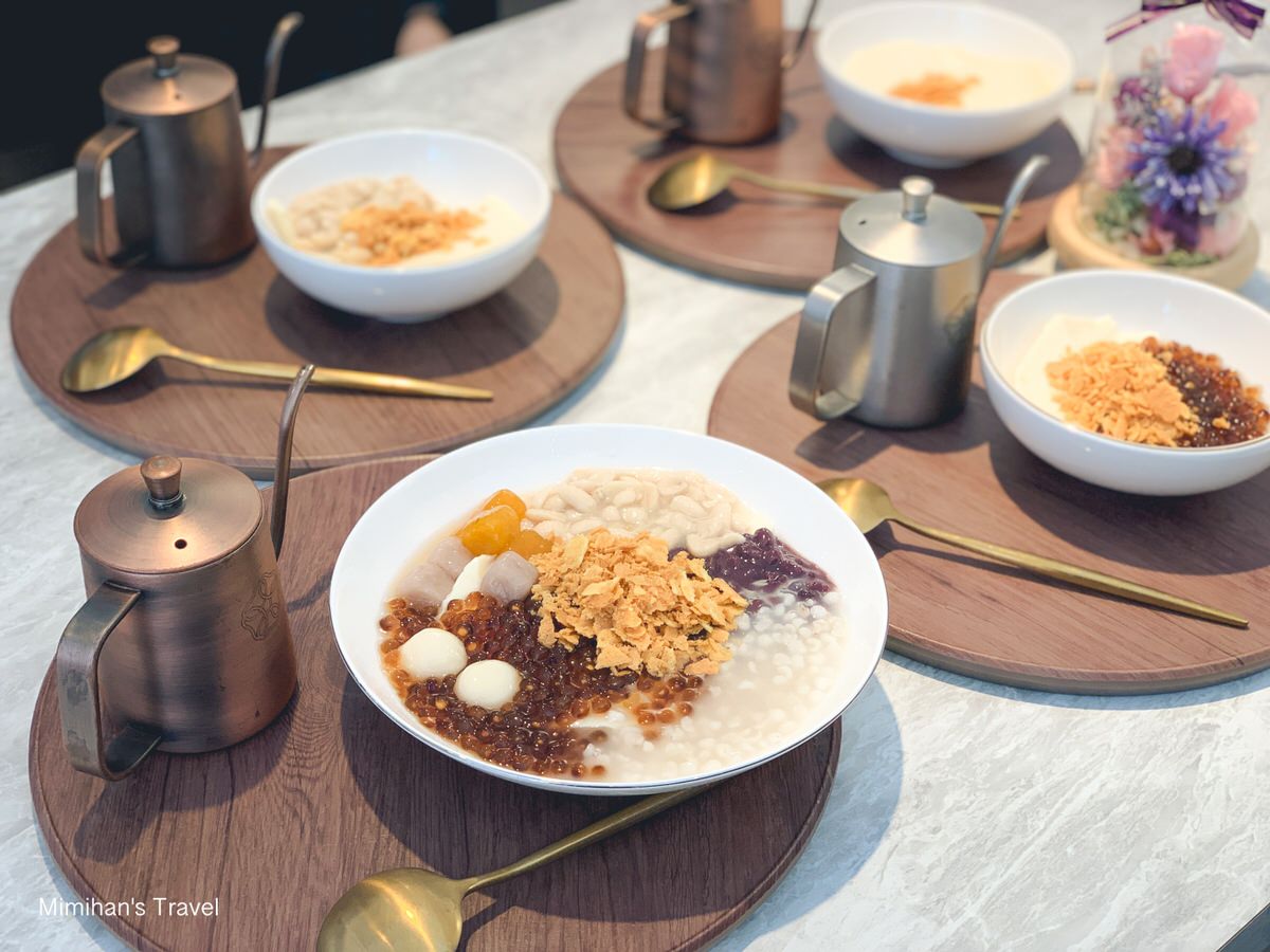 壺豆花的糖水(泰奶和豆漿)是另外用銅壺盛裝,讓客人自己邊吃邊淋,我們這天就點了泰奶什麼都想吃壺豆花、花生壺豆花、蜜粉圓壺豆花和經典壺豆花,其實主要差異就是配料的種類囉!沒多久豆花就上桌了,還有小圓木餐盤裝飾,感覺很清新呢~