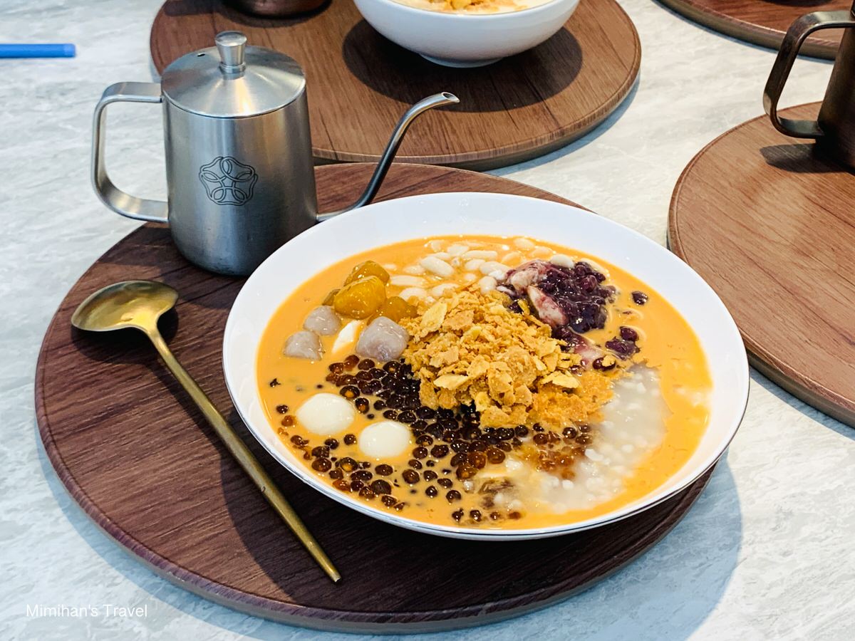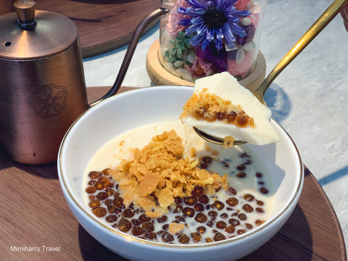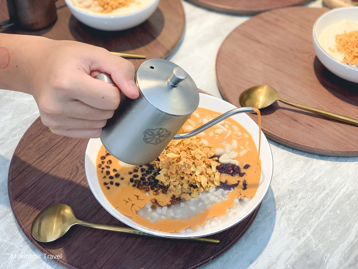 自己的豆花自己淋,整個吃起來不會太甜,口味真的是還蠻不賴的,而且第一次看到有人把豆花的糖水換成泰奶,那顏色很新奇很搶眼啊!