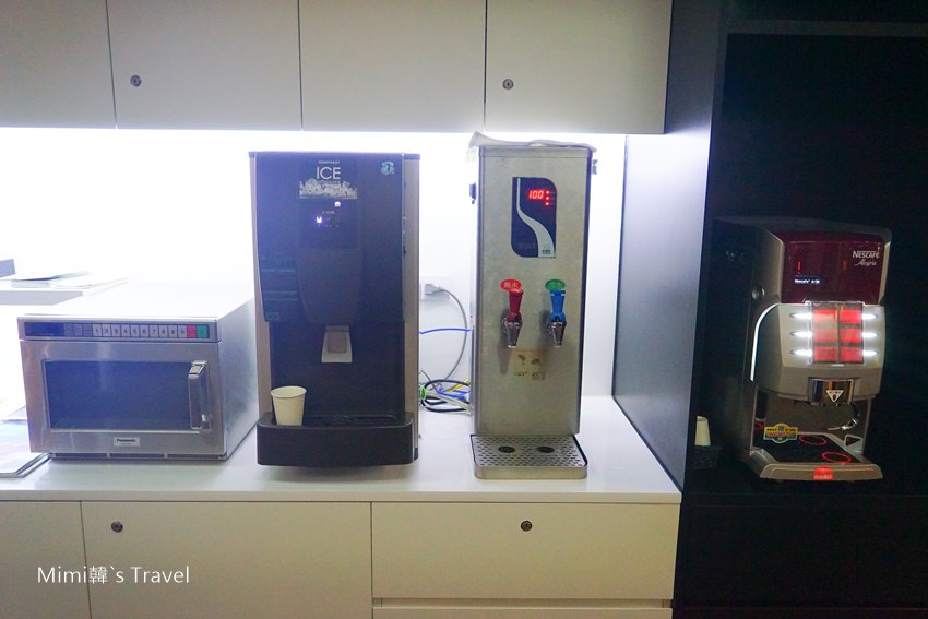 吧檯有微波爐、咖啡機、冷熱水和冰塊,冰箱裡還有飲料和芋頭冰...都是免費使用