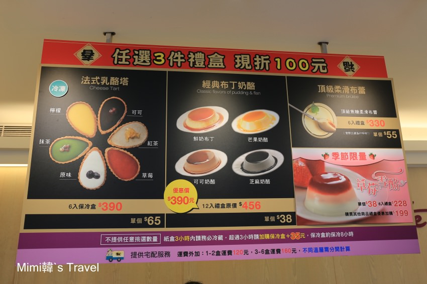 農曆新年前後目前正推出年節優惠,法式乳酪塔、經典布丁奶酪、頂級柔滑布蕾等,現在任選三件禮盒現折100元,而且布丁禮盒還有優惠價$390元 😆