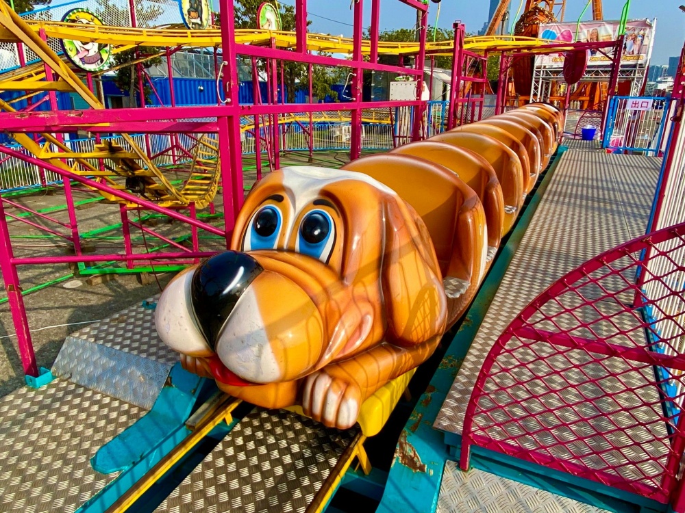▲台南JETS嘉年華設施:狗狗飛車,親子版雲霄飛車,適合大人小孩一同玩樂