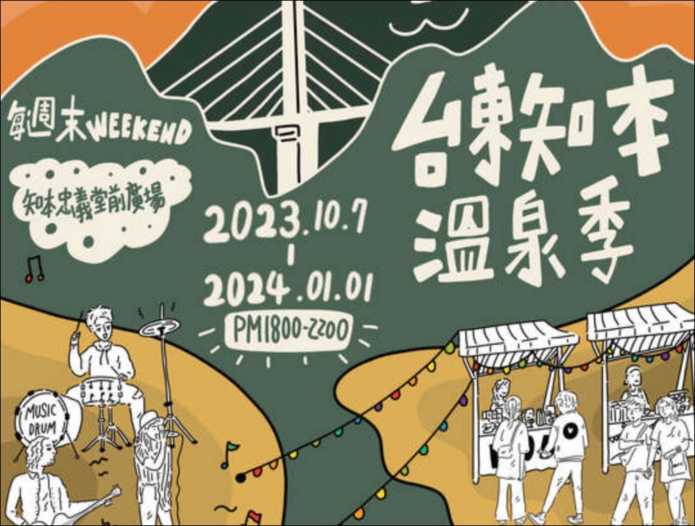 台東知本溫泉季會場就在以忠義堂廣場的周邊,包含舞台區、暖市集,還有主題燈飾區,每週邀請的台東在地歌手會公佈在台東知本溫泉季粉絲團。的另外幾家與AGODA配合的知本溫泉飯店旅館也都在附近,一直熱鬧到2024元旦。