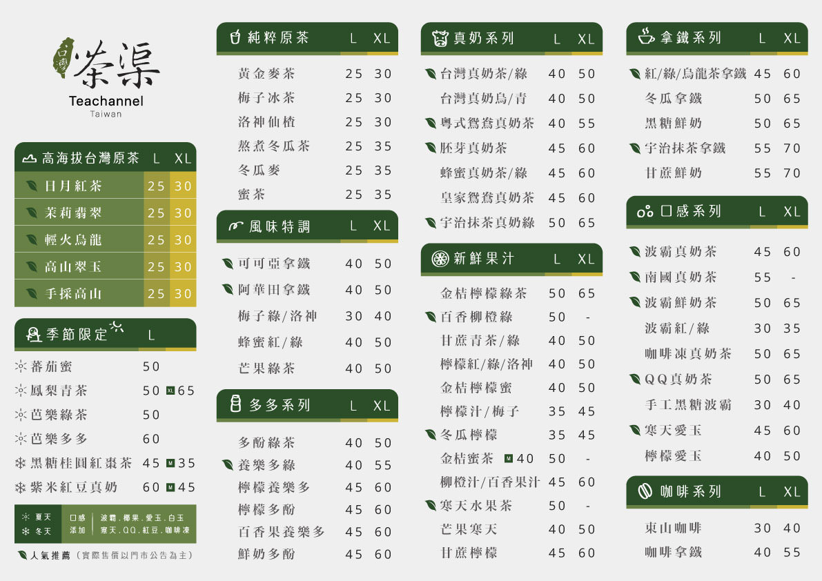 附上台灣茶渠南部的菜單,高海拔台灣原茶25~30元、季節限定鮮果系列35~60元、連最受歡迎的”真奶茶”口感系列也就是40~60元,價格非常正常,沒有會讓人感覺卻步的數字,而且目前茶葉大升級喲~