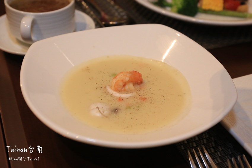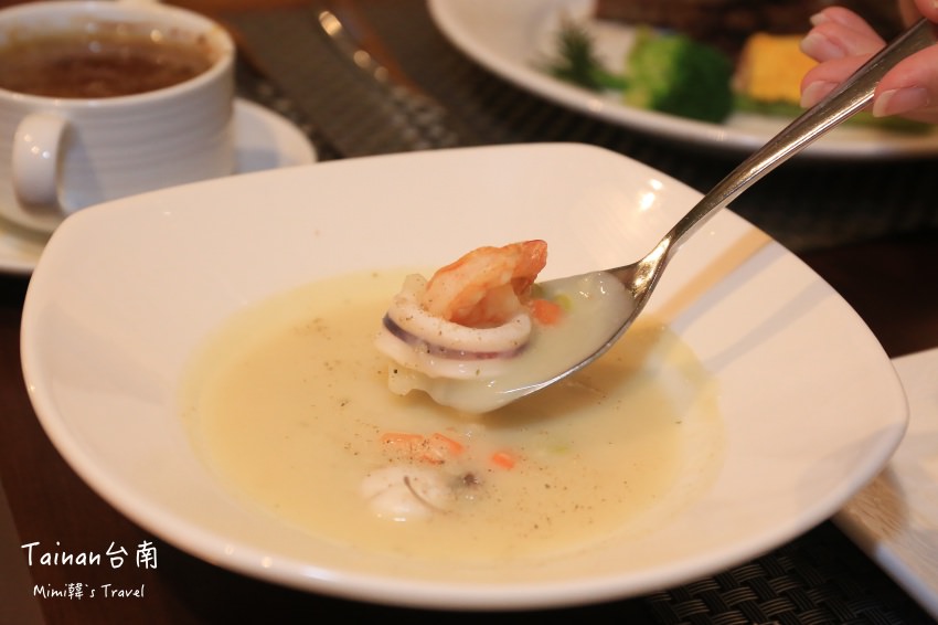 主廚海鮮濃湯口感香濃,裡面放了鮮蝦、花枝、小卷等海鮮食材,熱騰騰很快就被我們喝光光哩~