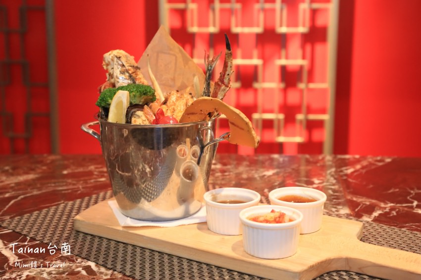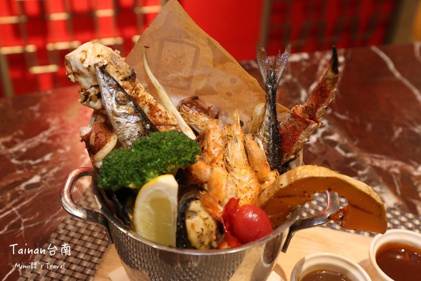 這名稱也太符合了!真的就是一桶海鮮,裡面裝著來自俄羅斯的帝王蟹腿和很多種海鮮食材,撒上紅椒粉、大蒜和主廚特製的辛香料一起炭烤,不只鎖住海鮮的原味,更與碳香味一起相得益彰,是款吃起來很有美式風味的料理。