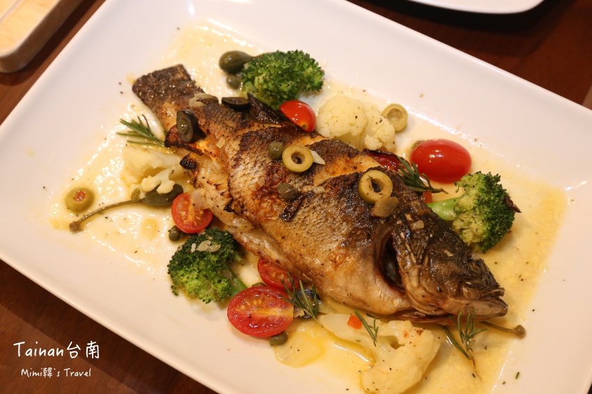 除了牛排和龍蝦,例如有的長輩喜歡吃魚肉的話,主餐也可以考慮這道焗烤寶石鱸魚。這種寶石鱸魚是澳洲引進的品種,主廚把番茄、辛香料炭烤後塞入魚腹中,再搭配大量蔬菜鋪在烤盤底部去焗烤,最後再淋上白葡萄酒&特製香料奶油,整個味道也是很不賴,我覺得是一款中式西吃的料理,但我覺得用刀叉吃有骨頭的魚肉有點麻煩,超想請服務生幫我準備筷子的啦 😆