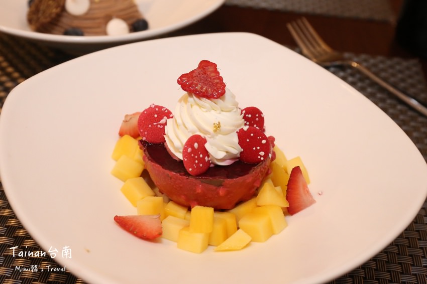 餐後的甜點也不馬虎,話說白柚泰莓巧克力脆皮球這名稱也太繞舌,包含水果、奶油、巧克力和那粉紅色的脆外皮都可以吃,整份的口感是酸酸甜甜的滋味,上面甚至還撒了金箔,貴氣十足。