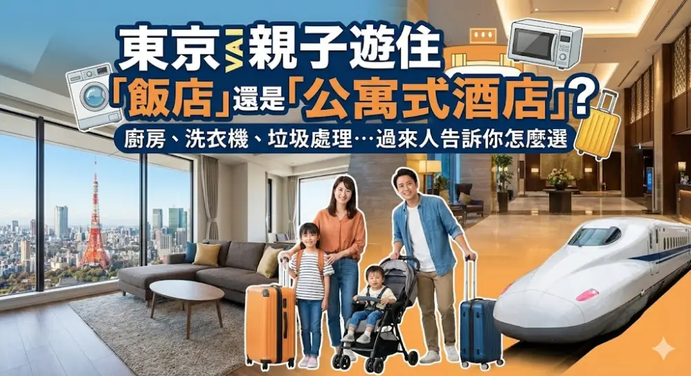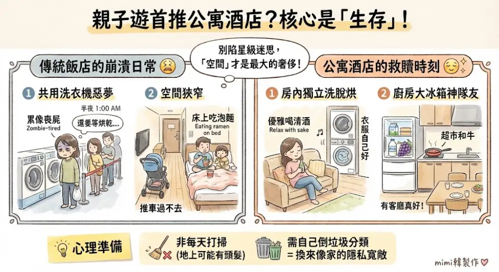 以前我總覺得出國就要住飯店享受「茶來伸手」的服務,但自從住過 MIMARU 或 MONday Apart 這種公寓式酒店那種像「家」一樣的便利性後,真的回不去了。雖然一般飯店有每日清潔和精緻早餐,但當妳面對一堆髒衣服、小孩想喝溫牛奶,而房間只有一台要排隊的投幣式洗衣機跟那個窄到連鮮奶都塞不進去的小冰箱時,真的會讓媽媽原地崩潰。這篇文章我會把這兩種類型做個血淋淋的對比,告訴妳那些訂房網站不會寫出來的過來人經驗。