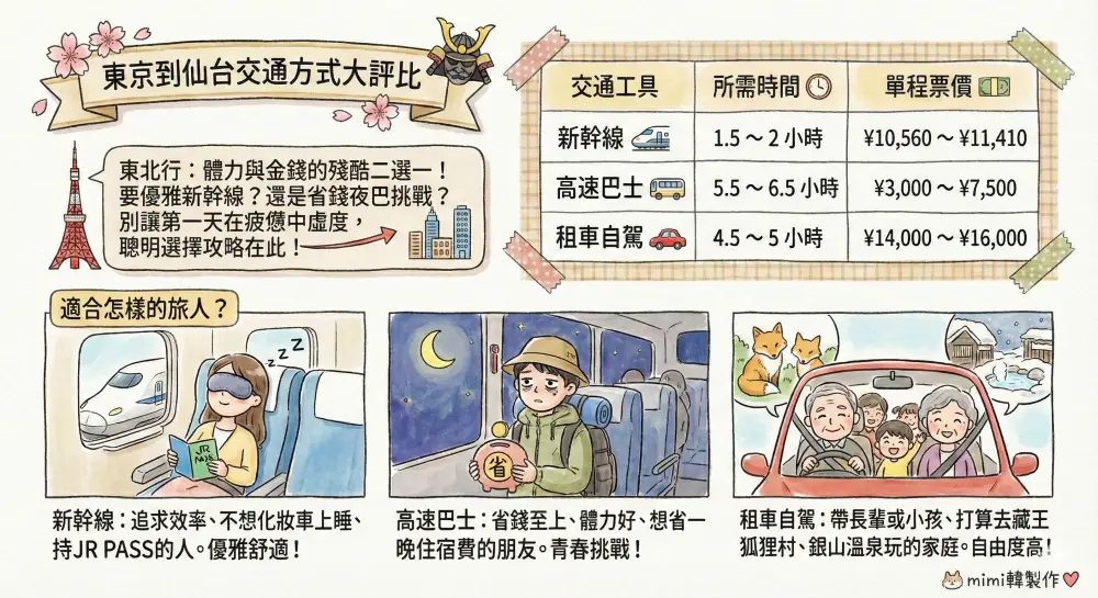 【2026東京到仙台交通】新幹線/夜巴/自駕優缺點比較,省錢避雷全攻略!