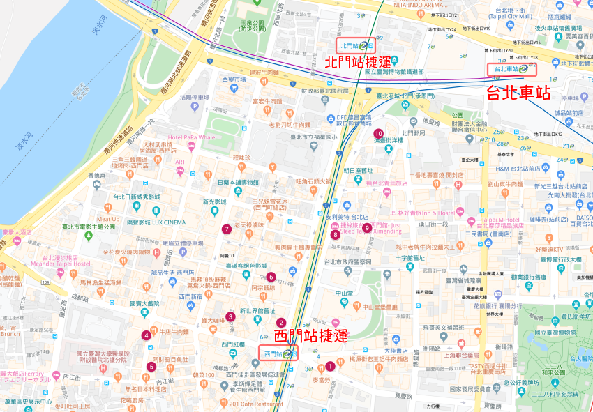 先把這10家精選後的西門町住宿、西門町飯店的位置都標出來,附近就有超便利的台北捷運西門站,中華路公車路線密集班次多,離台北車站、台北轉運站也都不遠,交通便利度也是極好,絕對是來台北旅遊很棒的住宿地點。