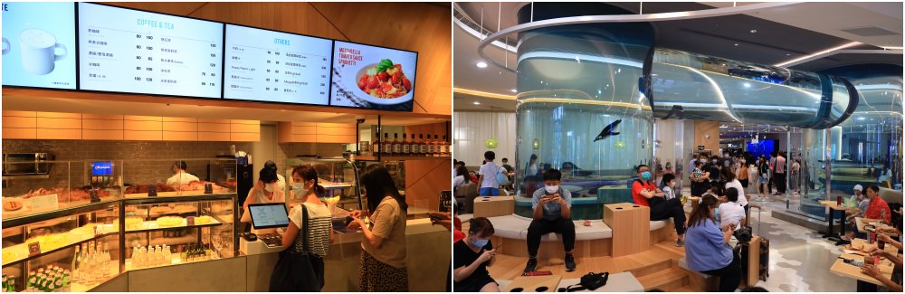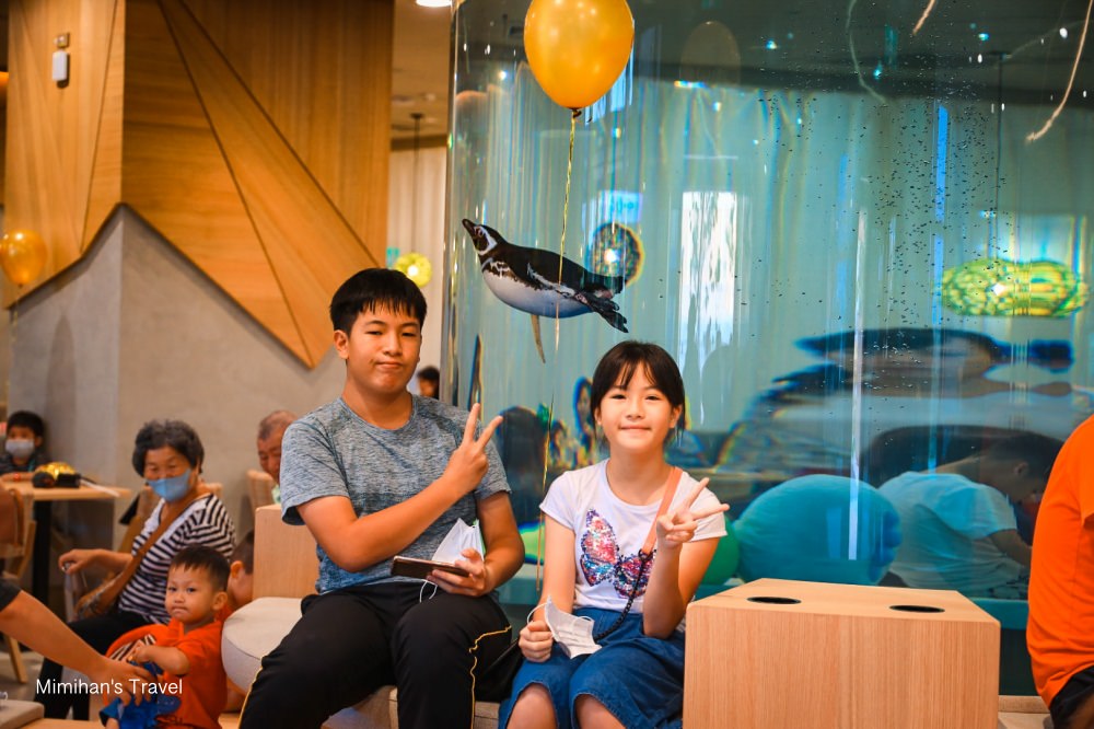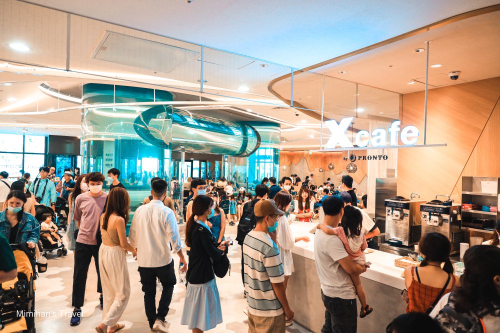 X CAFE也是桃園水族館裡的大亮點,空間有和企鵝奇遇區連通的水道,隨意點個企鵝銅鑼燒、企鵝拿鐵坐下來休息片刻,就會看到企鵝們從身邊或頭頂穿梭過,有時候牠們還會好奇心爆發停下來看看我們這些人在做啥,是很特別的感受。