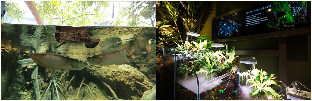 這展區佈置成熱帶雨林的環境,裡面展示了銀板魚、黑白皇冠魟、帝王魟、亞洲龍魚、南美短鯛等在台灣河川生態中的魚類,還會搭配閃電、雷聲雨聲等聲光效果,讓人更有身歷其境的感覺。