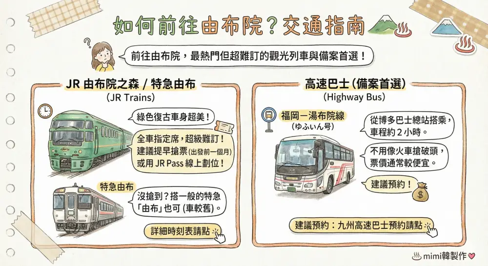 - 高速巴士: 這是我的備案首選。從博多巴士總站搭乘福岡-湯布院線(ゆふいん号)高速巴士,車程約2小時,不用像火車那樣搶破頭,而且票價通常比火車便宜。建議預約:九州高速巴士預約請點