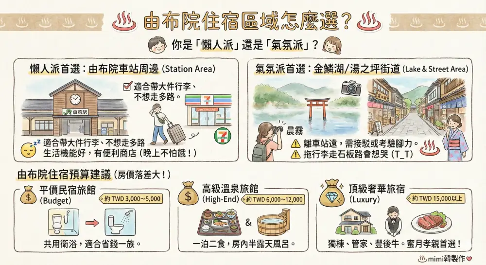 - 金鱗湖/湯之坪街道周邊: 適合想要一早去拍晨霧、享受溫泉街氣氛的人。缺點是離車站較遠,雖然大多飯店有接駁,但如果想隨時出來逛逛,可能要稍微考量腳力,拖著行李走石板路會想哭。