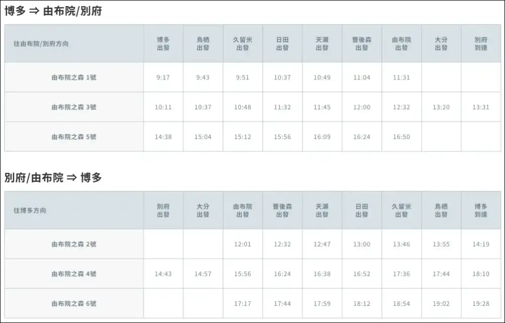 | 由布院之森 1, 2, 5, 6 號 | 博多 ⇄ 由布院 | 最經典,班次時間最剛好。 |